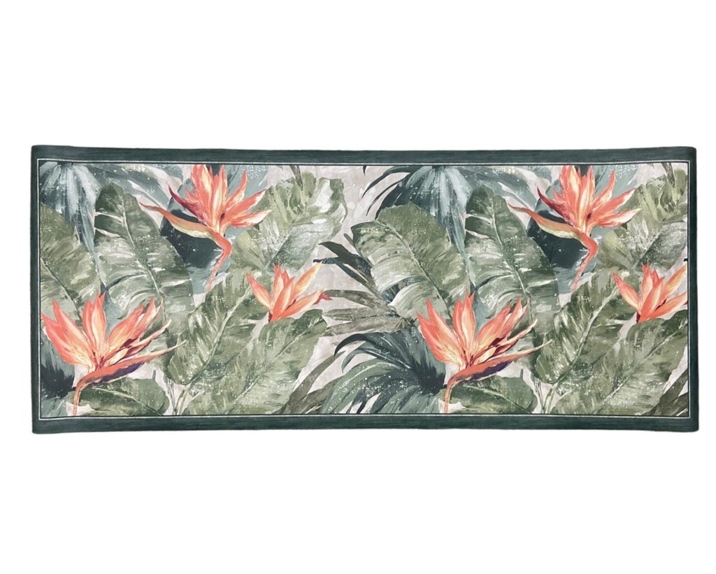 Alfombra vinílica en colores verdes con estampado de hojas.