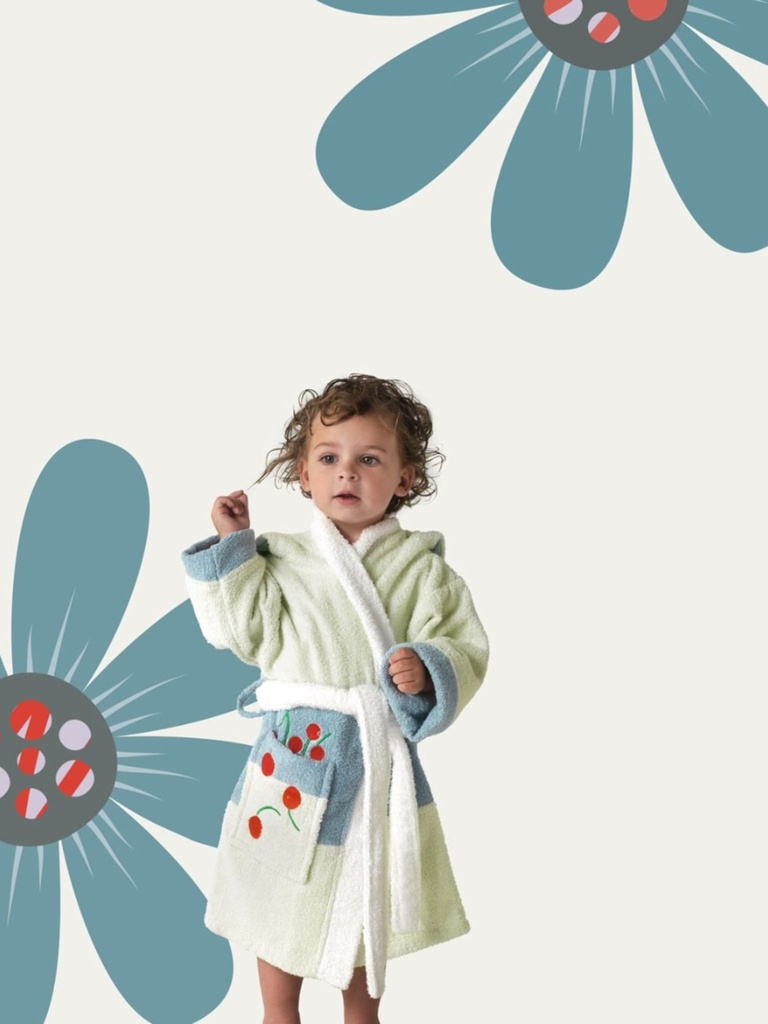Albornoz infantil verde agua y celeste, con toques rojos, simula a un mapache. Ideal para regalar. Con bolsillos y cierre de lazo. Unisex.