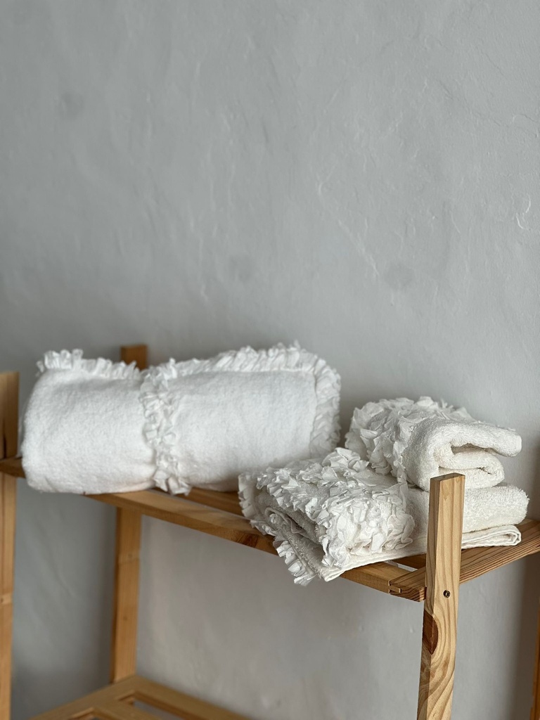 Juego de toallas con volantes de diseño italiano. El set incluye 3 piezas de toalla: tocador, lavabo y ducha.