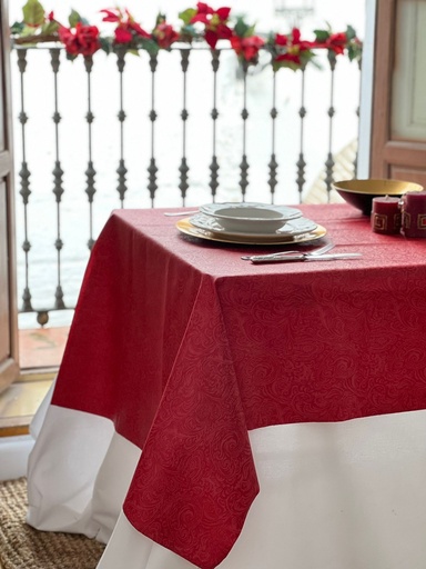 Mantel antimanchas con estampado de cachemira, con doble capa de resina para darle un acabado perfecto, sin dobladillos. Puede contactar con nosotros a través del formulario de contacto para más información sobre otras medidas.