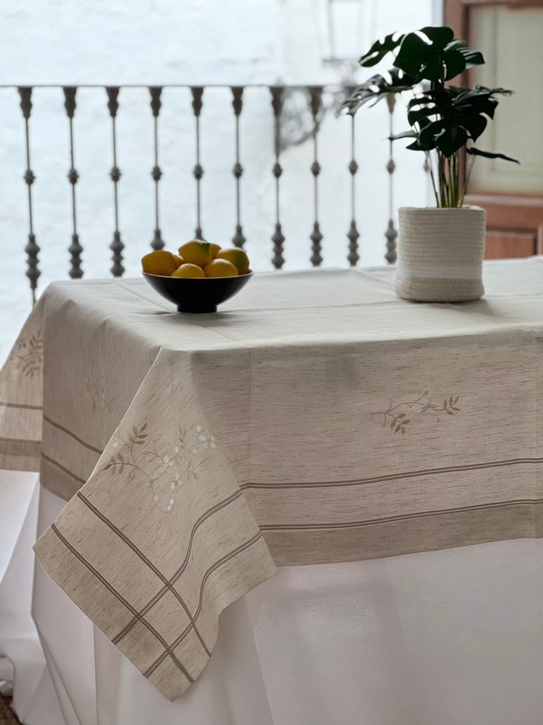 Elegante tapete en color beige con pequeñas flores grabadas y con un diseño de líneas en los laterales.